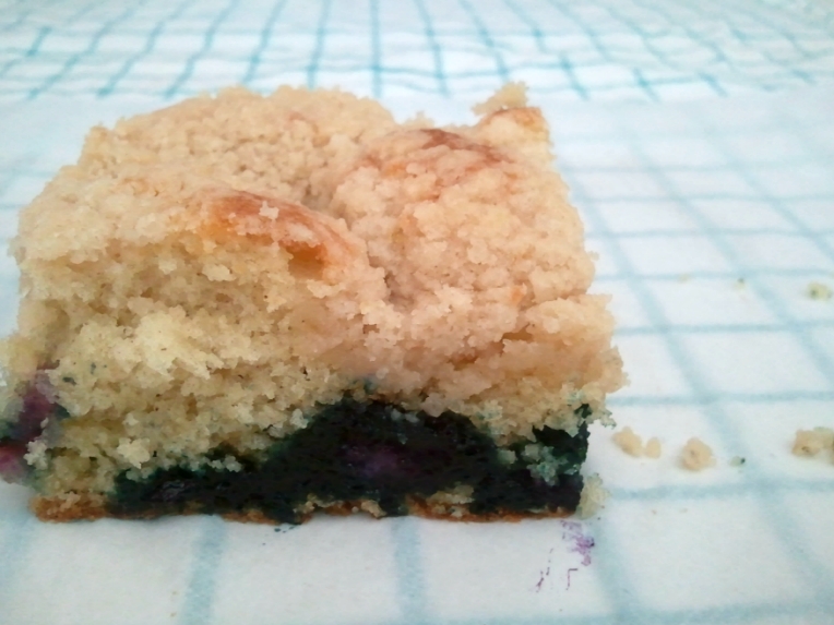 Usually, when I bake things in a square pan, the edges become a little firmer than the inside, but this cake is moist and tender right until the very edge of it. When I hold it in my hands, they kind of feel marshmallow-y and very soft, and they almost fall apart because of their tenderness. The streusel crumbs on top have a very slight crunch, but they're still on the softer side. And they don't even have a lot of butter in them! But don't get me wrong. It is NOT over-tender.